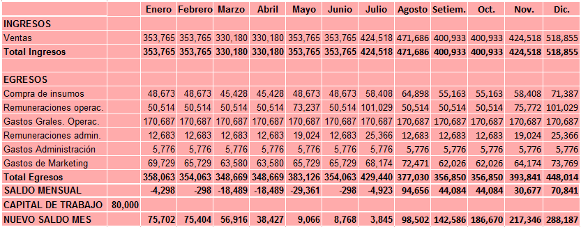 O S /. 80.000 são usados para financiar operações nos primeiros 7 meses e cobrem déficits de caixa mensais. Este montante é usado mês a mês e, portanto, diminui mês a mês até atingir S /. 3.845 em julho, mantendo sempre saldos positivos. Desta forma, o negócio pode operar e manter a continuidade de suas operações.