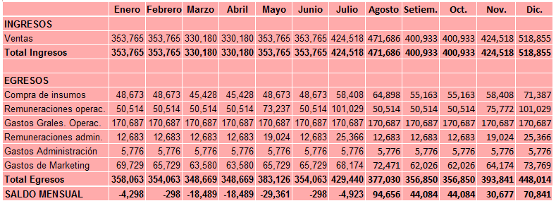 Um detalhe importante a considerar, e talvez você tenha pensado, é que o S / .80,000 será mantido em uma caixa por 7 meses; e pode não ser conveniente por causa do custo financeiro (juros) que implicaria tê-los. Portanto, dependendo de cada caso particular, esta quantidade pode ser injectado para o negócio em duas partes (por exemplo S /. 24,000 para os primeiros três meses e depois S /. 56000 para as restantes cinco meses), ou em três ou mais .