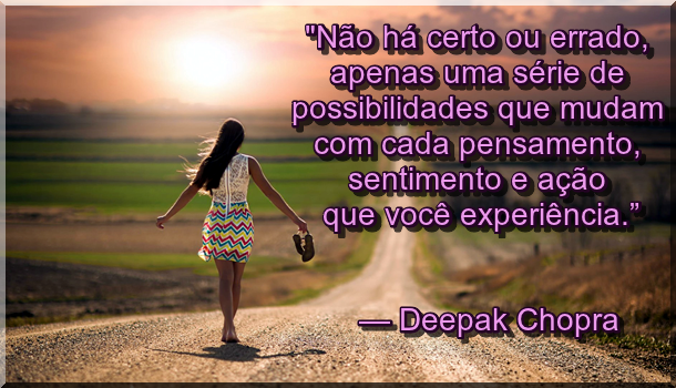 "Se você ficar obcecado sobre se você está tomando a decisão certa, basicamente você está acreditando que o universo vai recompensá-lo por uma coisa e puni-lo pela outra. O universo não tem agenda fixa. Depois de tomar qualquer decisão, ele funciona em torno dessa decisão. Não há certo ou errado, apenas uma série de possibilidades que mudam com cada pensamento, sentimento e ação que você experiência.” — Deepak Chopra